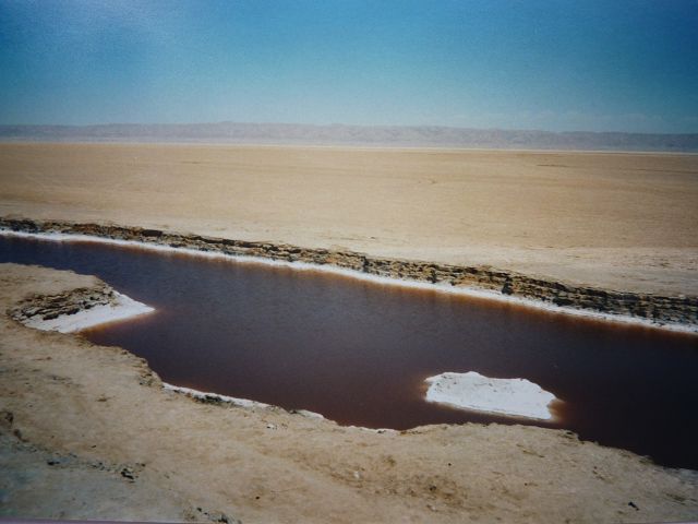 Hier und da waren viereckige Löcher im Boden. Dort wurde Salz gebrochen. Da kann man sehr schön sehen, wie dick diese Salzkruste ist, nämlich dreißig bis fünfzig Zentimeter. Das Wasser darinnen ist rötlich.